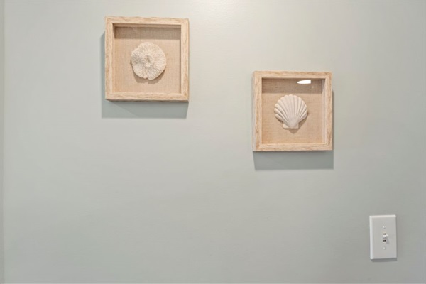 Full bathroom along the hallway with large shower, vanity, and storage.